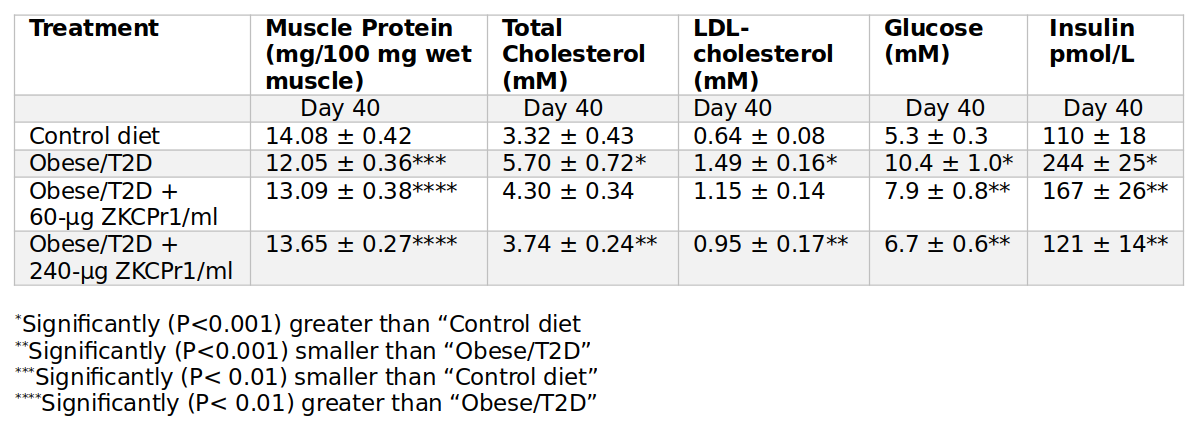 Beginning on day 17 and continuing through day 40, Group 1 continued on SD, while Groups 2 through 4 remained on the HFD. During this period, Groups 3 and 4 also received fresh water containing ZKCPr1 for 23 consecutive days; specifically, Group 3 received 60 μg ZKCPr1/ml water, and Group 4 received 240 μg ZKCPr1/ml water in both cases ZKCPr1 provided daily from 9 p.m. to 9 a.m. All procedures for which the data is shown in the TABLE below were performed on day 40. Blood samples for glucose, serum lipids, and insulin measurements were collected from the eye corner. After the body weight of each mouse was recorded, the animals were euthanized by cervical dislocation. The gastrocnemius muscle was isolated for assessments of muscle weight and total protein content. For surgical removal and measurement of visceral fat the technique described by others was used [Gabriely, I., Ma, X.H., Yang, X.M. et al. Removal of visceral fat prevents insulin resistance and glucose intolerance of aging: an adipokine-mediated process? Diabetes, 51, 2951-2958, 2002].